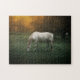 Ein weißes Pferd beim grasen auf grüner Weide in der Abendsonne
