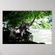 Ein Gemälde eines schwarzen Einhorns an einem Fluss von seinem Waldrand aus.