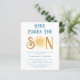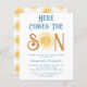 Mit dieser niedlichen preiswerten Babydusche laden Familie und Freunde zu einer sonnengefleckten Babydusche ein. Es enthält den Text "Here Comes The Son" in blauer Retro-Typografie mit einer niedlichen gelben Aquarellsonne. Der Rücken ist mit einem sonnigen Muster dekoriert. Einfach anpassbar. Original Wasserfarbe © Michele Davies.