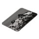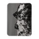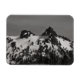 Ein Schwarz-Weiß-Foto von zwei Gipfeln in der Tatoosh Range, bekannt als The Castle and The Pinnacle. Die Bergkette ist schneebedeckt, obwohl es Sommer ist. Es gibt Bäume und Steine, die über die Landschaft und die Berge verstreut sind. Die Lage der Sonne erlaubt es, Schatten auf den Berg zu werfen. Inkognito Wolken ziehen den Himmel an. Image Copyright ©2023 Kimberly J Tilley. zazzle.com/store/developingnature