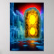 Ein Eistor mit goldgelber Farbe, umgeben von Eis und einem roten Licht hinter dem Tor. Das ist eine künstlerische KI.