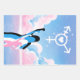 Feminine Silhouetten stehen unter einem Himmel wie Zuckerwatte mit einem weißen Transgender-Symbol darin wie das Bat-Signal, es hat ein Herz in der Mitte.