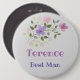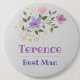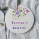 Einführung des Trauzeugen - ein Button-Abzeichen mit dem Namen und einer Blumendarstellung. Abzeichen zur Identifizierung von Hochzeiten.