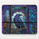 Ein spukiger, gruseliger Rabe, der in Buntglas dekoriert ist, dreht den Blick auf den Betrachter.