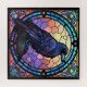 Ein spukiger, gruseliger Rabe, der in Buntglas dekoriert ist, dreht den Blick auf den Betrachter.