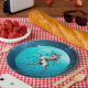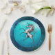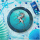 Vintages Zinnsilber heraldry Stil Einhorn Illustration auf blaue Aquarellscheibe mit dunklerem Himmelshintergrund.