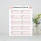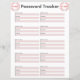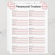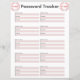 Password Tracker mit Platz für Website oder App-Namen, Benutzername und Passwort.