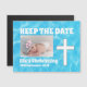 Magnetic "Behalt the Date" Christening Erinnerung. Einfaches Christening-Design von Wasser und ein Kreuz mit Platz für ein Foto.
