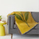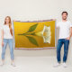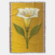 Eine weiße Datura-Blume (Stechapfel) mit grünen Blättern vor einem lebhaften gelben Hintergrund, der ihre kühne, trompetenartige Form und ätherische Präsenz betont.