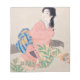 Dieses Design zeigt ein Bild eines Seidengemäldes der japanischen Künstlerin Uemura Shoen (上 村 園, 1875-1949). Die Künstlerin ist besonders berühmt für ihre Darstellungen wunderschöner Frauen im Nihonga (日 本 画) Stil, obwohl sie auch viele Werke zu historischen Themen und traditionellen Themen produziert hat. Sie erhielt viele Auszeichnungen und andere Formen der Anerkennung während ihres Lebens, da sie die erste weibliche Präsidentin des Japanischen Kulturordens (文 化 章) war; sie wurde auch als offizielle Künstlerin des Kaiserlichen Hauses eingestellt, die zuvor nur eine andere offizielle Frau in dieser Position eingestellt hatte. Das hier gezeigte Gemälde ist im Bjinga (美 人 画) Stil gehalten, der ein allgemeiner Begriff für Bilder von schönen Frauen in der japanischen Kunst ist, insbesondere im Holzschnitt des Genres ukiyo-e. Es zeigt Akizuki Miyuki, eine Figur aus einem klassischen Joruri (浄 瑠 璃) Drama, eine traditionelle Form des Geschichtenerzählens, begleitet von Musik. Das Original (娘 深 雪) wurde 1914 fertig gestellt.