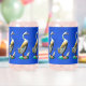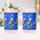 Mehrere Beispiele einer bemalten, geschnitzten Holzente mit ihrem Enkeln, stark verwittert, auf blauem Hintergrund. Passen Sie Ihren eigenen Text auf der Rückseite an.