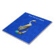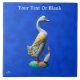 Eine gemalte, geschnitzte Holzente mit ihrem Enkeln, stark verwittert, auf blauem Hintergrund. Fügen Sie Ihren eigenen Text hinzu.