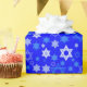 Wickeln Sie oben Ihre Chanukka-Geschenke mit diesem Papier ein, das den Davidsstern In einer Vielzahl von Entwürfen und in den Schatten von Blauem und von Weiß auf einem blauen Hintergrund kennzeichnet.