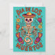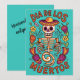 Esta tarjeta es ideal para regalar en el "Dia de los Muertos". Su diseno se centra en un esqueleto como figura principal con un sombrero de estilo mexicano.