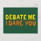 Debattiere mich, ich wage dich. Ein zuversichtliches Rede- und Diskussionsteam zitiert von einer Person, die sich durch jede Diskussion oder Konkurrenz streiten kann. Cooler, hellgelber und orangefarbener Text auf dieser Redner Spaß Postkarte für einen öffentlichen Lautsprecher. Haben Sie die Zuversicht, dass Sie jedes Argument gewinnen werden.