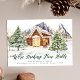 Elegante, bewegende Ankündigungen mit einer rustikalen, schneebedeckten Blockhütte inmitten von Bergen und Kiefern. "We're Decking New Halls" wird in einem dunkelgrünen Skript angezeigt, in dem Ihre Adresse unten angezeigt wird. Die Meldung für die Blockhüttenbewegung kehrt zu einem schneebedeckten dunkelgrünen Hintergrund zurück.