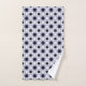 Towels and a washcloth feature a geometric pattern with navy blue stars and circles on a white background, providing a modern and sophisticated look.