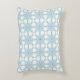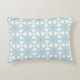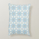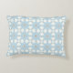 A decorative pillow featuring a symmetrical geometric pattern with blue, white, and brown hues shown from the front and back on a gray background.