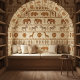 This eye-catching design features intricately patterned elephants, zebras, rhinoceroses, lions, and monkeys arranged in stylized horizontal bands. Each animal and decorative border is filled with geometric, tribal-inspired markings, creating the sophisticated look of hand-stamped or woven textile art. The rich, earthy palette of browns and tans against a textured light background offers a warm, mature, and gender-neutral aesthetic, perfect for adding an authentic, bohemian touch to a nursery, living room, or study. Search ID1243 to see all the products in this design set. Note: design adapted from generative content.