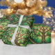 Decorative wrapping paper with a repeating Tree of Life pattern in green tones featuring intricate branches and red fruit within circular motifs.