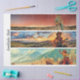 • Middle Panel: A sunset serenade unfolds as a plaid-shirted cowgirl plays acoustic guitar on a rocky overlook. Rolling hills, golden clouds, and a shimmering coastline set the stage for soulful reflection. This lady is the famous Debbie Flick that has the best heart and loves horses.