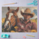 Diese friedliche Szene fängt einen Moment tiefer Verbindung zwischen einem Cowboy und seinem Pferd ein. Der Cowboy, der in einem klassischen karierten Shirt und einer abgenutzten Jeans gekleidet ist, liegt neben seinem Kastanienpferd, das sich in der Nähe bewundert. Ein Gelbfeld erstreckt sich um sie herum, und der Himmel darüber ist weich und verträumt, gefüllt mit blauen Wolken, die durch ein sanftes Blau treiben. Die entspannte Haltung beider Figuren lässt auf völlige Leichtigkeit schließen - zwei Freunde machen eine Pause unter dem offenen Himmel. Es ist evokativ und kinematisch, wie ein Landlied, das zum Leben erweckt wird. Cowboy Reitpferd - Friedliche Landszene in der Wildblume Field Cowboy Pferdekunst, rustikales Erholung Moment, Western Cowboy friedliche Bild, Pferdebegleiter Landkunst, Kariertes Shirt Cowboy Wildblume, Dreamy sky ländliche Dekoration, Kastanienpferdchen-Druck, Quiet Cowboy Naturkunst, Foto Lifestyle Kunstwerk, Pastoral Cowboy-Bild.