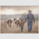 Das Bild erfasst einen ruhigen Moment in einer ländlichen Landschaft. Ein Mann und sein junger Sohn gehen Hand in Hand durch ein Feld, der drei weißen und braunen Kühen folgt. Der Mann trägt einen Cowboyhut, ein kariertes Shirt, Jeans und Stiefel, während der Junge in einer braunen Jacke, in Jeans und Stiefeln gekleidet ist. Die Kühe entfernen sich von der Kamera, und der Hintergrund ist durch einen weichen, bewölkten Himmel mit weit entfernten Bäumen gekennzeichnet. Dieses Bild verdeutlicht die Verbindung zwischen Mensch und Tier, indem es eine Landwirtschaft oder einen Ranching-Lebensstil und die friedliche Verbindung zur Naturlandschaft darstellt. Landschaft, Mensch und Junge, die Hand in Hand gehen, Kühe folgen, Cowboyhut, kariertes Shirt, braune Jacke, weiße und braune Kühe, landwirtschaftliche Lebensweise, ranching Lifestyle, Mensch-Tier-Bindung, friedliche Verbindung zur Natur, Ruhe, Pastoralszene.