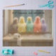 Five fluffy pastel-colored chicks—brown, yellow, green, orange, and purple—stand side by side on a rustic windowsill, gazing out a foggy farmhouse window. Their tail feathers are fluffed high, and torn bits of toilet tissue rest gently across them, with a roll perched nearby. This surreal, humorous composition blends cozy cottage charm with cheeky personality, perfect for DIY artists, farmhouse decorators, and anyone who loves a good laugh in their creative space.