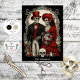 This striking decoupage design blends romance and the macabre in a gothic wedding scene featuring two skeleton figures dressed in ornate Victorian attire. The groom wears a black suit with a red vest and top hat, while the bride stuns in a red gown and floral hat, both holding crimson rose bouquets. Surrounded by vintage floral and skull motifs, the composition evokes timeless love with a dark, whimsical twist.