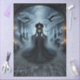 This gothic decoupage sheet captures a haunting moment in a misty graveyard, where a mysterious woman stands in flowing black lace beneath swirling veils and candlelight. Her wide-brimmed hat, pale skin, and ethereal presence evoke supernatural elegance, while ravens circle above and tombstones loom behind. The arched stone entrance and flickering candles frame the scene in dramatic shadow, making this design perfect for Halloween crafts, gothic journals, or fantasy-themed mixed media. Ideal for layered collage, storytelling art, or seasonal showcases, this image blends mystery, beauty, and dark enchantment.