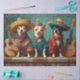This playful panel features three spirited Chihuahuas dressed in vibrant traditional Mexican attire, each rocking a sombrero and colorful poncho or shirt. Seated side by side against a textured teal backdrop, they’re flanked by acoustic guitars and bursting with personality. From pom-pom hats to intricate woven patterns, every detail celebrates cultural charm and canine sass. Perfect for whimsical trays, pet-themed furniture art, or layered mixed media projects that bring joy, humor, and fiesta flair to your creative space.