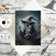 A haunting skeletal figure stands cloaked in tattered robes, crowned with a towering pointed witch hat adorned in eerie elegance. Her long gray hair flows like smoke, and a black cat with piercing green eyes perches on her bony arm, casting a chilling gaze. Bats swirl through a cracked teal and gray backdrop, adding motion to the surreal, textured atmosphere. This dark fantasy portrait blends death, magic, and mystery—ideal for Halloween decor, gothic storytelling, or supernatural branding.