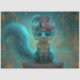 Victorian blue fox fantasy art, whimsical animal with top hat, magical creature in teal swirl, anthropomorphic fox with lace collar, regal fox on golden cushion, surreal fashion animal for crafting, dreamy turquoise and gold background, expressive eyes and fluffy tail, mystical fox for mixed media, enchanted animal portrait for artists.