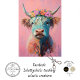 Hochlandkuh mit einer Krone von Blume, Set vor einem rosa Hintergrund. Das lang gezogene Haar der Kuh wird in lebhaften Blau-, Orange- und Weißtönen gehalten und bildet so ein skurriles und farbenprächtiges Portrait. Der ruhige und neutrale Ausdruck der Kuh trägt zur ruhigen und charmanten Atmosphäre des Kunstwerks bei. Dieses Stück verbindet wunderschöne Elemente rustikalen Charmes mit künstlerischem Flair und macht es zu einer reizvollen Ergänzung zu jeder Kollektion