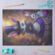 Das Bild zeigt eine skurrile, fantasievolle Szene mit zwei anthropomorphischen Kaninchen. Das Zentralkaninchen ist in einem Viktorianischen und raffinierten Ambiente mit lila Kleid, weißer Schürze und einem großen, mit einer Uhr geschmückten Hut gekleidet. Dieses Kaninchen hält eine Taschenuhr. Das zweite, kleinere und weiße Kaninchen ist auf den Hinterbeinen stehend und scheint mit dem Zentralkaninchen zu interagieren. Der Hintergrund ist ein zauberhafter Wald mit übergroßen Pilzen, glänzenden Laternen und einer bezaubernden Atmosphäre. Das Bild erinnert an Blondine und ihre Kaninchenthemen mit ihrer detaillierten und fantasievollen Darstellung einer fantastischen Welt. whimsical Kaninchen, Viktorianisches Kaninchen, Fantasy-Szene, magischer Wald, anthropomorphe Tiere, Alice Adventures Thema, übergroße Pilze, glühende Laternen, bezaubernde Atmosphäre, RHDesigns von 2chattychicks.