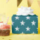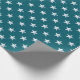 Ein festes Verpackungspapier mit dunkelblauem, aquamarinem Hintergrund, das in einem Wiederholmuster silberne Sterne schimmert.