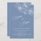 Minimalist design with white floral sketch cherry blossoms and on a dusty blue background. Modern botanical hand drawn wedding invitation with bride and groom names in an elegant calligraphic script. With your photo on the backside.