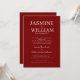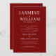 Celebrate your love story with this classic and elegant wedding invitation. Featuring a deep red background and sophisticated white script font, this design exudes timeless romance. The clear layout ensures all essential details of your special day are beautifully presented, from the names of the happy couple to the ceremony and reception information. It's the perfect way to set a refined tone for your wedding. This invitation is designed to impress your guests and make your wedding announcement truly memorable.