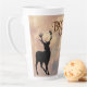 Hirschjäger latte Tasse mit Namensvorlage. Waldlanddesign mit Hirschbildern und Waldhintergrund umhüllen diese große Tasse. Die Farben sind braun, braun, grau und schwarz, auf der links Seitenfläche des Designs ist der Name in grauem Druck. Ein nettes Geschenk für einen Mann, der gerne jagen möchte.