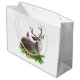 A red cardinal stands on the back of a stag surrounded by holly and evergreens on this festive holiday gift bag.