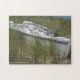 Ein kleines weißes Boot, das dauerhaft auf den Ufern von Virginia im Gras und im Sand auf den Strand gesetzt wird.