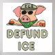 Defund ICE zeigt einen US-Beauftragten für Einwanderungs- und Zollabfertigung, der Hut, Schattierungen und Masken trägt, mit den Worten "Defund ICE" darunter. Jede Ähnlichkeit mit einem Schwein ist völlig zufällig.