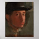 In diesem Selbstporträt dreht sich ein junger Edgar Degas um den Kopf, um den Zuschauer anzusehen. Er trägt lässige Kleidung, darunter ein offener Kragen und ein breit geflochtener Hut. Die informelle, extreme nah-up-Sichtweise von Degas' Gesichtsausdruck und sein impassiver, beinahe düsterer Ausdruck spiegeln die Unantastbarkeit seiner Kleidung wider. Die kleine, informelle Präsentation und die Leichtigkeit der Touch unterstreichen die Intimität dieses Bildes und den immer noch zaghaften Charakter des jungen Künstlers. Um 1857, als er dreiundzwanzig oder vierundzwanzig war, reiste Degas nach Italien, wo er einen Großteil seiner Zeit damit verbrachte, nach den Meistern der Renaissance Kopien zu machen. Die Zeit war eine Phase der Bildung, und er zeichnete prolistisch und schrieb in einem seiner Notizbücher: "Ich muss mir klar machen, dass ich überhaupt nichts weiß; es ist der einzige Weg, voran zu kommen." In sich selbst einen willigen Sitzer zu finden, machte er fünfzehn oder mehr Selbstporträts in verschiedenen Medien während seiner Zeit in Italien.