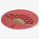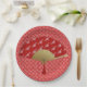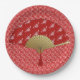 Ein Art-Deco japanischer Fan-Papier-Teller in einer Reproduktion eines stilisierten Art-Déco-Schmetterlingsmusters - weiß auf dunkelchinesischem Rot, mit einer geprägten Goldbasis und einem koordinierenden Deko-gemusterten Hintergrund