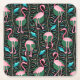 Dieser dekorative PapierUntersetzerentwurf des eleganten Flamingovogelmusters wird in einer retro Dekoart der Kunst-20s gemacht. Die helle rosa Flamingo-Erholung gegen einen Hintergrund, der Farnwedel in den mutigen Farben und in den geometrischen rechteckigen Formen in den Schatten des aquamarinen Grüns/des Türkisblaus umfaßt, alle auf einem Hintergrund des Schwarzen. Diese Vorlage, stylized Entwurf ist für jedermann perfekt, nach dem Lieben diese tropischen Tiere und einem eleganten Muster mit einer retro Zwanzigerjahre Drehung sucht.