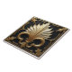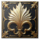 Eine quadratische Reliefskulptur auf schwarzem Hintergrund mit einem zentralen und eleganten Art-Déco-Fleur-de-lis-Design in Elfenbein und Gold, umgeben von verzierten Blattmustern und einem Goldrahmen. Die Fleur-de-lis sind mit länglichen, gekrümmten Blättern stilisiert, und die Goldakzente heben die Kanten und Details des Designs hervor. Die Rahmen- und Blattmuster im Umkreis sind aufwändig detailliert, was zu der luxuriösen und dekorativen Ästhetik des Stückes insgesamt beiträgt.