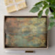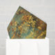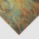 Das ist ein verziertes, dekoratives Muster in Goldtönen, Türkis und Rost. Das Design umfasst komplexe, symmetrische Damast- oder Arabesken-Motive, die stilisierten Akanthus-Blätter, Rollen und Blumenelementen in vertikalen Spalten ähneln. Die Muster haben ein bedrücktes, verwittertes Aussehen mit verblassten und abgenutzten Bereichen, die türkis und rostfrei unter der goldenen Oberschicht aufdecken. Dieser altertümliche Patina-Effekt verleiht dem Design ein antikes oder Vintages Gefühl.