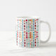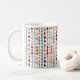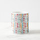 Diese Tasse hat ein modernes Design von Kreise und Ovalen in Retrofarben, die auf einem weißen Feld zusammengeschraubt sind.