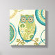 © Veronique Charron / Wilder Apple. Ein dekoratives Bild einer Eule und kreisförmige Muster und Designs. Der Hintergrund ist ein bräunliches Blumenmuster.