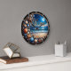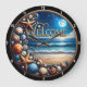 Dekorative Seashell und Starfish Uhr mit Beach and Ocean Design Eine dekorative Wanduhr mit Muscheln und Seestern Set gegen einen Meeresstrand und Nachthimmel, die an ruhige Küstenvibes erinnert.